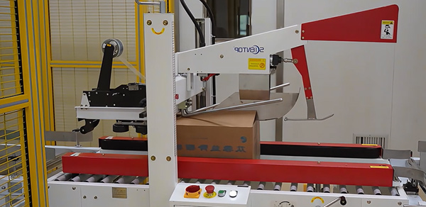 該工位將由上游輸送來的未封蓋的紙箱,通過膠帶實現(xiàn)自動封箱,密封方式可為一字封或定制其他膠帶封箱樣式;同時,可增配自動扎帶設備;通過調(diào)節(jié)可適用于不同尺寸的紙箱。