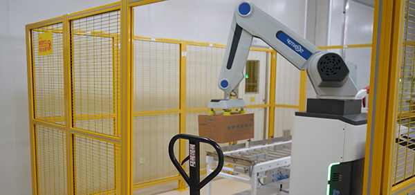 該工位將前端輸送來的已封好紙箱輸送至指定位置,自動碼垛機器人通過吸盤將紙箱按規定方式整齊碼放在托盤上;根據包裝方式、尺寸、負載等要求不同可定制抓取方式及承載能力。